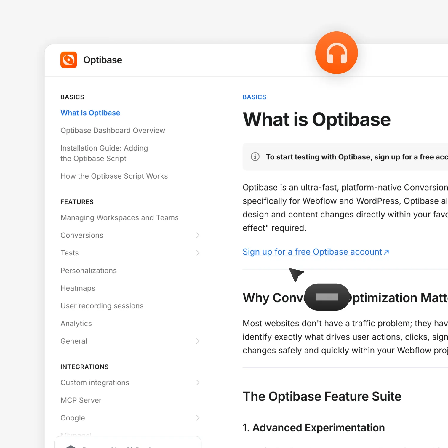 Your marketing team creates test variants using Optibase's visual editor. No code, no engineering tickets, no QA cycles. They can test headlines, CTAs, sections, or full page layouts independently — without waiting on development resources. Works across Webflow, WordPress, and more.